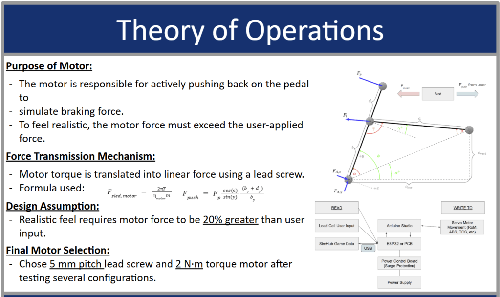 Existing force feedback pedals ($2000+) are very expensive and are growing in popularity, as they offer users adjustable pedal stiffness, travel distance, and ABS and traction control feedback. The group aimed to design a pedal with similar functions within a budget of $250.