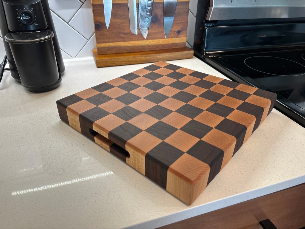 I was commissioned to build an end-grain, maple/walnut chess board cutting board for a local charity auction.